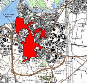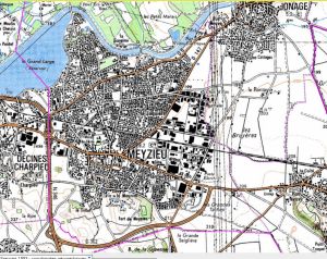 Sélectionnez dans le catalogue de couches la zone de Lyon et affichez la carte de 1947. Zoomer sur Meyzieu. Affichez ensuite au dessus de la carte la couche Limites administratives (Unités administratives)
