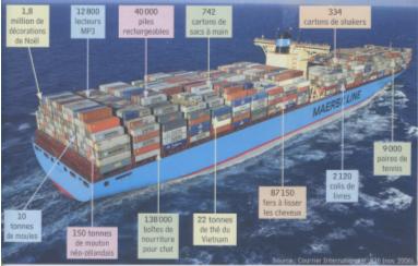 2- L'Emma Maersk, plus gros porte-conteneurs en service : il peut embarquer jusqu'à 13500 conteneurs. Lancé en 2006 pour le compte d'une compagnie danoise, Maersk Line, il mesure près de 400 m de long et 60 m de large. Avec un équipage de 13 personnes, il assure des navettes entre l'Asie du Sud-Est et l'Europe du Nord, avec à son bord plus de 150000 tonnes de marchandises.
