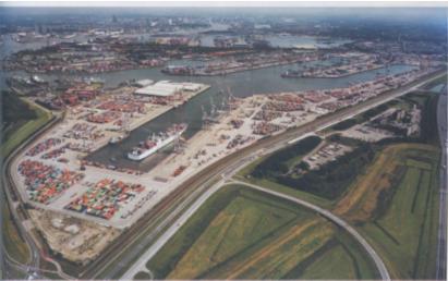 1- Rotterdam, 1er port européen 3ème rang mondial, constitue le cœur de la façade maritime de l'Europe du Nord, commande un vaste arrière-pays. Des terminaux de conteneurs et des voies de communication s'étendent en direction de la mer du Nord.