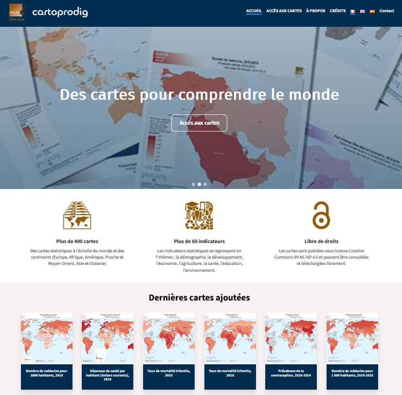 Allant de l’échelle mondiale à infra-continentale, les cartes sous regroupées en sept thèmes principaux et reposent sur les données les plus récentes. Elles sont sous licence Creative Commons. PRODIG est une Unité Mixte de Recherche (CNRS – université) dont l’acronyme signifie Pôle de recherche pour l’organisation et la diffusion de l’information géographique.