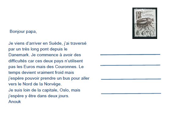 Pourquoi le choix de cet ouvrage ? Dès le mois de septembre, nous avions souhaité rencontrer Coline Pierré car son livre est celui qui nous semblait le plus adapté au niveau de lecture de nos élèves et il nous permettait un travail transdisciplinaire. Les six livres de la sélection ont été lus pendant un temps de lecture organisé par la vie scolaire. Tous les livres n'ont pas été lus par tous les élèves mais tous en ont lus au moins deux. Le livre de Coline Pierré a été lu pendant les cours de français. Lancement : « Si Anouk avait fugué pour rejoindre sa mère à NY Alesund en Norvège, voici le chemin qu’elle aurait pu suivre : Allemagne, Danemark, Suède, Norvège, Finlande, Norvège, ville de Tromso, ville de Longyeargyen, ville de Templefijord. » Chaque élève doit se mettre à la place d’Anouk et écrire une carte postale depuis ce pays à son père pour lui raconter où elle est, ce qu'elle voit et ce qu'elle fait. Activité : faire une recherche sur l'un des pays traversés par Anouk, si celle-ci était partie rejoindre sa mère à NY Alesund en Norvège. Consignes :