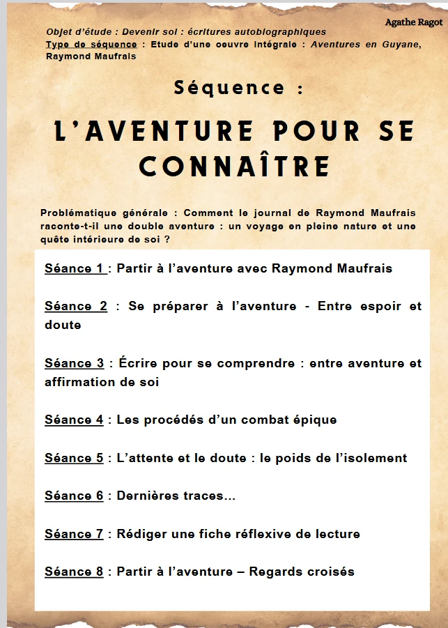 Cette séquence propose une immersion sensible dans le journal de Raymond Maufrais. À travers lectures, débats, productions orales et écrites, les élèves explorent la construction de soi par l’écriture intime et la confrontation au monde. La figure de l’explorateur devient le fil rouge d’une réflexion sur l’identité, le dépassement de soi et le rapport à l’autre.