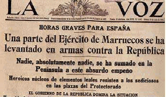 Le 18 Juillet 1936, le journal "La Voz" titre "Heures graves pour l'Espagne". "Une partie de l'armée du Maroc s'est soulevée contre la République. Personne, absolument personne dans la péninsule ne s'est rallié à ce putsch absurde. D'héroïques noyaux fidèles au pouvoir légal résistent aux séditieux-Le gouvernement de la République domine la situation..."
