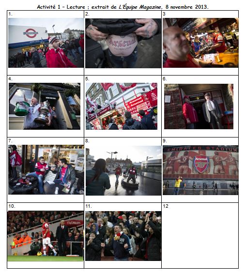 Les élèves travaillent à partir de photographies parues dans L’Équipe Magazine (8 novembre 2013) sur l'environnement et le déroulement d'un match de football en Angleterre.