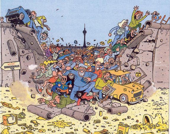 Parmi les nombreux dessins de presse consacrés à l'événement, celui de Gehrard Seyfried est particulièrement intéressant à exploiter avec des élèves: en effet, si les berlinois de l'est (et les citoyens de RDA) se ruent dès les premières heures de l'ouverture avec "cabas et Trabant" vers le paradis capitaliste de la consommation, l'Ouest offre une vitrine bien trompeuse qui masque pour peu de temps les réalités à venir: chômage, fin de l'état "providence", entrée dans un monde régi par l'efficacité et la rentabilité... thèmes repris par le très subtil "Goodbye Lenin" de Wolfgang Becker (2003)