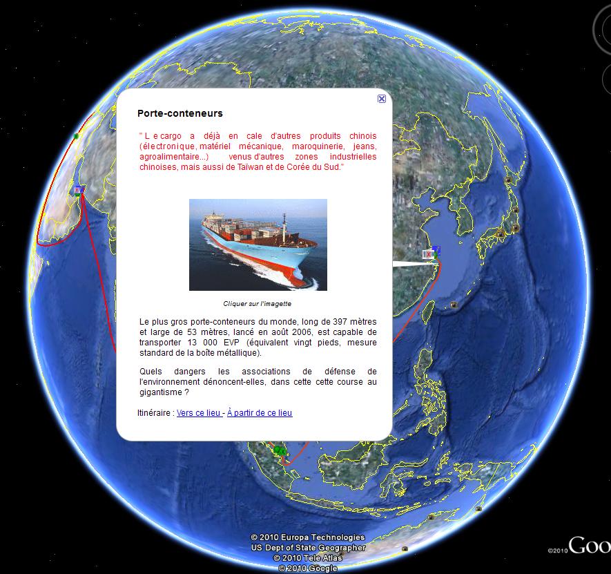 Pour la première partie de cette séance, "Qu'est-ce qu'un flux ?", les élèves aboutissent à la définition d'un flux à travers le voyage d'un conteneur sur google earth (voir fichier kmz). Ce voyage d'un porte-conteneurs (Chine - Europe) et le questionnement joint à la séance, adapté au LP et au programme, a été conçu d'après les « Voyages virtuels, parcours pédagogiques »de l'Académie de Grenoble.
