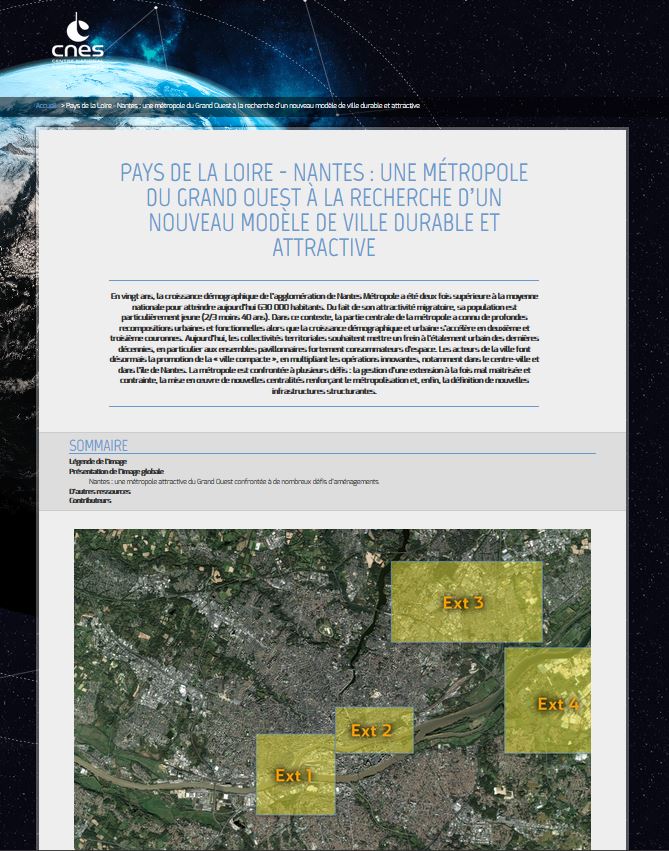 Cet article intitulé "Nantes : une métropole du Grand Ouest à la recherche d’un nouveau modèle de ville durable et attractive" s'appuie sur une image satellite d'ensemble de l'agglomération nantaise puis quatre images correspondant à quatre "zooms" thématiques.