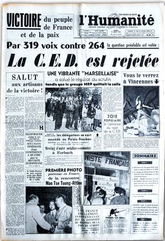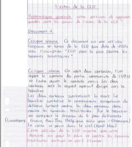 Questionnement : entre partisans et opposants, quelles sont les causes de l’échec de la CED ?Activité 1 ou Groupe 1 : travail de groupe permettant de confronter et exploiter les documents pour en faire un récit historique (un document à analyser avec méthode par élève, restitution devant le groupe et élaboration d’une synthèse commune à l’écrit [ou à l’oral (prise de notes)] à destination des autres groupes.