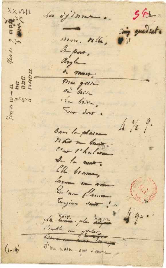 La première séance, largement inspirée de la présentation d’un formateur de l’IUFM de Nantes lorsque j’étais stagiaire, devait permettre de relier le sens et la forme du texte. Toujours en îlots, le poème Les Djinns de Victor Hugo a été distribué complètement déconstruit, comme s’il s’agissait d’un texte en prose. Les élèves devaient alors retrouver sa forme en justifiant leur proposition.