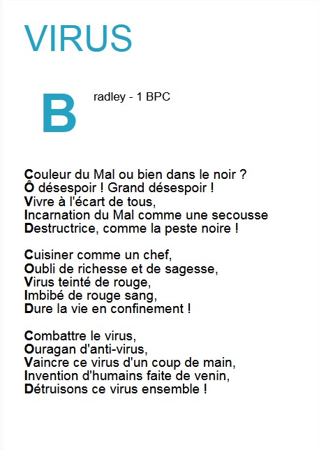 Devant la qualité des productions des élèves, un recueil a été réalisé avec les textes via Madmagz. Celui-ci est visible sur le site Internet du lycée, il a été transmis aux parents et certains poèmes défileront sur le tableau numérique du grand hall du lycée. L’objectif étant de valoriser le travail des élèves pour leur montrer qu’ils sont capables de produire des travaux de qualité.