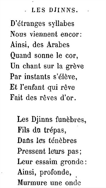 Ensuite, le poème a été distribué dans sa forme originelle. Les élèves devaient alors formuler des hypothèses quant au choix de cette représentation par Victor Hugo. L’étude du poème devait ensuite permettre aux élèves d’infirmer ou de confirmer leurs hypothèses. Ils ont réussi à associer le crescendo et le decrescendo au réseau lexical du bruit, et donc à l’arrivée et au départ des Djinns.