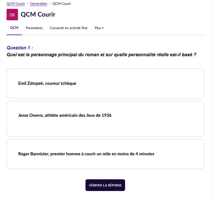Propositions multiples sur Courir : QCM, activité carnet de route, comparaison avec La Solitude du coureur de fond, le temps dans Courir