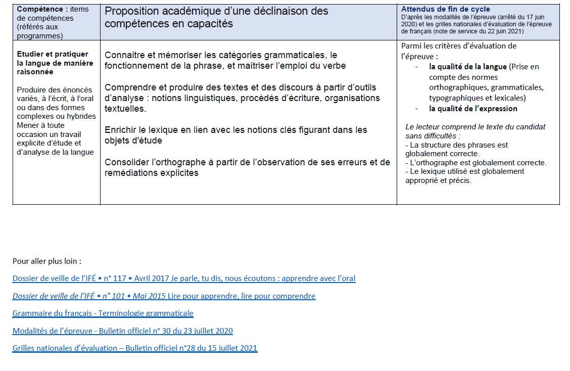 Enfin, l’épreuve ponctuelle de français à l’issue de la classe de Terminale (arrêté du 17 juin 2020) fixe des objectifs adossés aux quatre compétences et leurs items, dans les termes suivants :