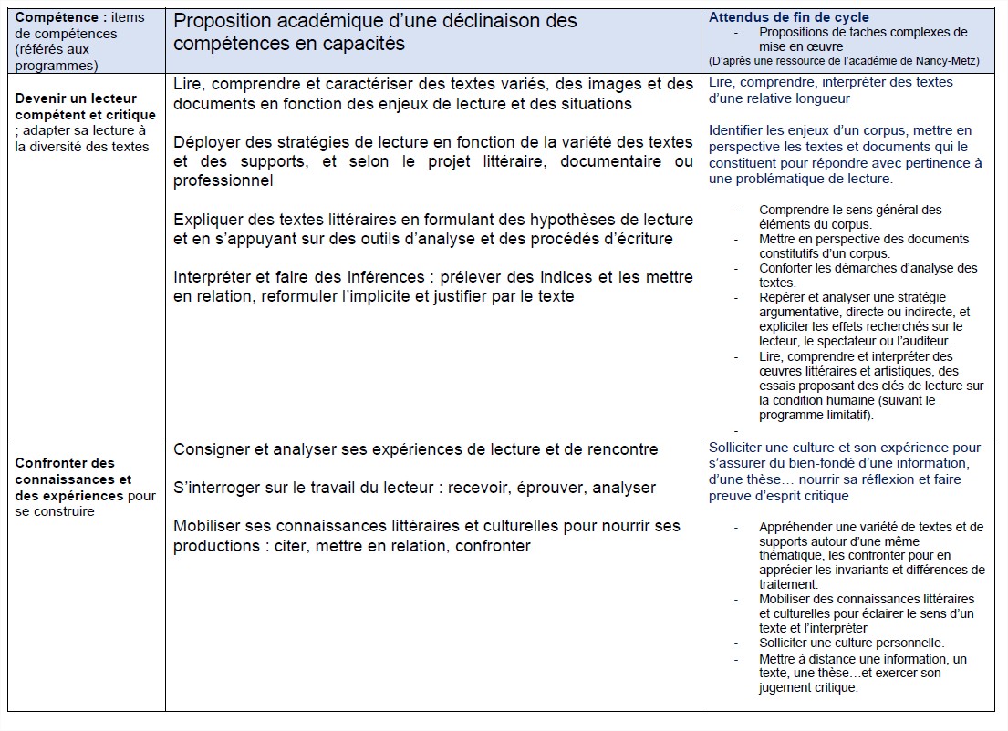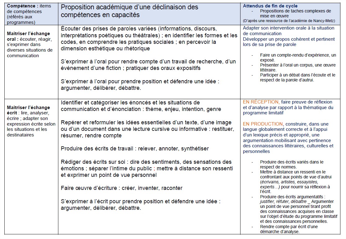 Il est donc nécessaire d’associer à chacune des quatre compétences évaluées en Français des capacités travaillées en classe et repérables dans les programmes, de seconde, première et terminale. Ces capacités ne sont cependant pas fixées ni explicitées dans des ressources nationales puisqu’elles sont à travailler tout au long du cycle dans le cadre des activités pédagogiques proposées aux élèves, ce qui relève de la liberté pédagogique et de la progression de l’enseignant.