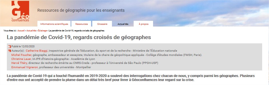 Collectif, « La pandémie de Covid-19, regards croisés de géographes », Géoconfluences, mai 2020.