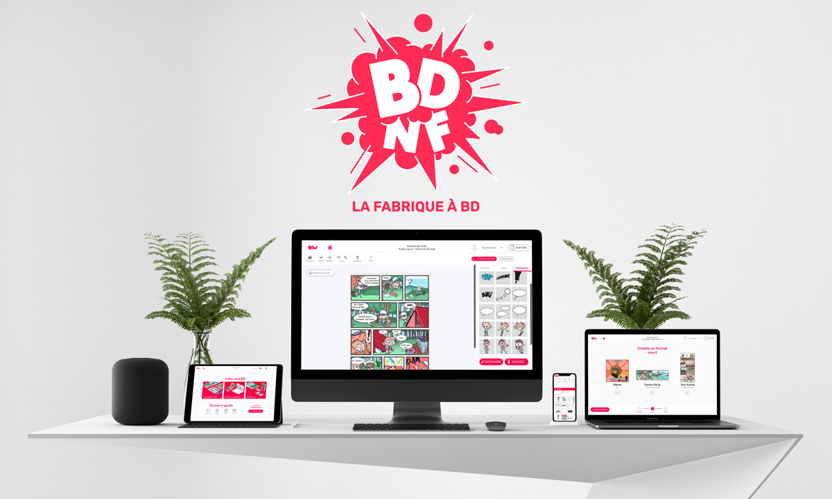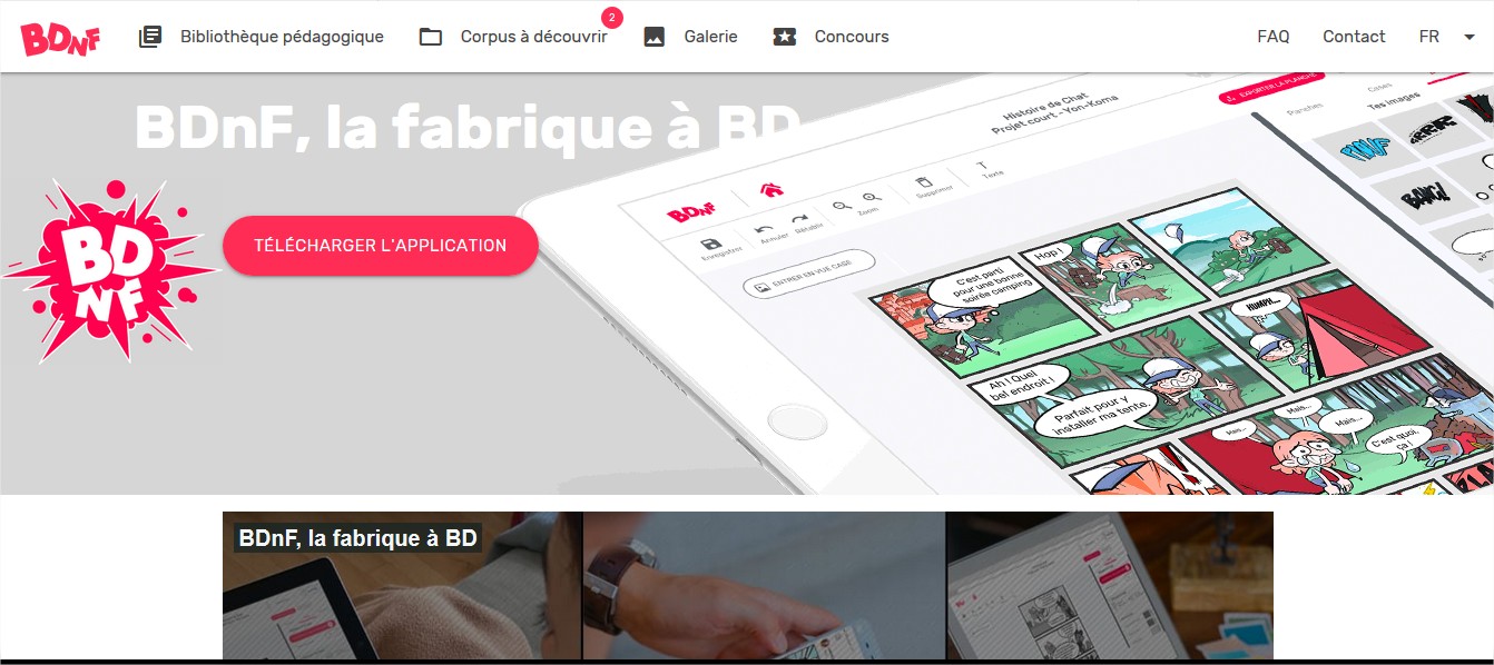 · L’application est disponible gratuitement, sur ordinateur et tablette et dans une version simplifiée sur smartphone, l’application BdnF permet de réaliser des bandes dessinées ou tout autre récit multimédia mêlant illustration et texte. Invitant à des allers retours permanents entre découverte et création, l’application est destinée aussi bien aux élèves dans le cadre scolaire qu’au grand public.