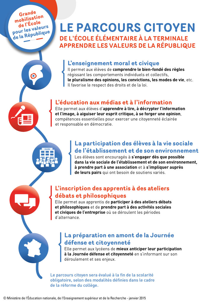 La mesure 3 des 11 principales mesures de la grande mobilisation pour les valeurs de la République concerne le parcours citoyen. Il s'agit de mettre la laïcité et la transmission des valeurs républicaines au cœur de la mobilisation de l’École, en créant un nouveau parcours éducatif de l'école élémentaire à la terminale.