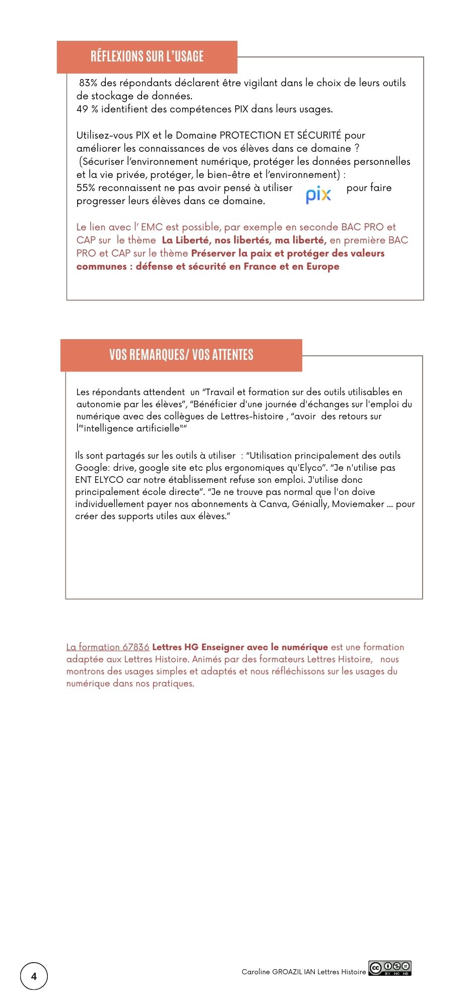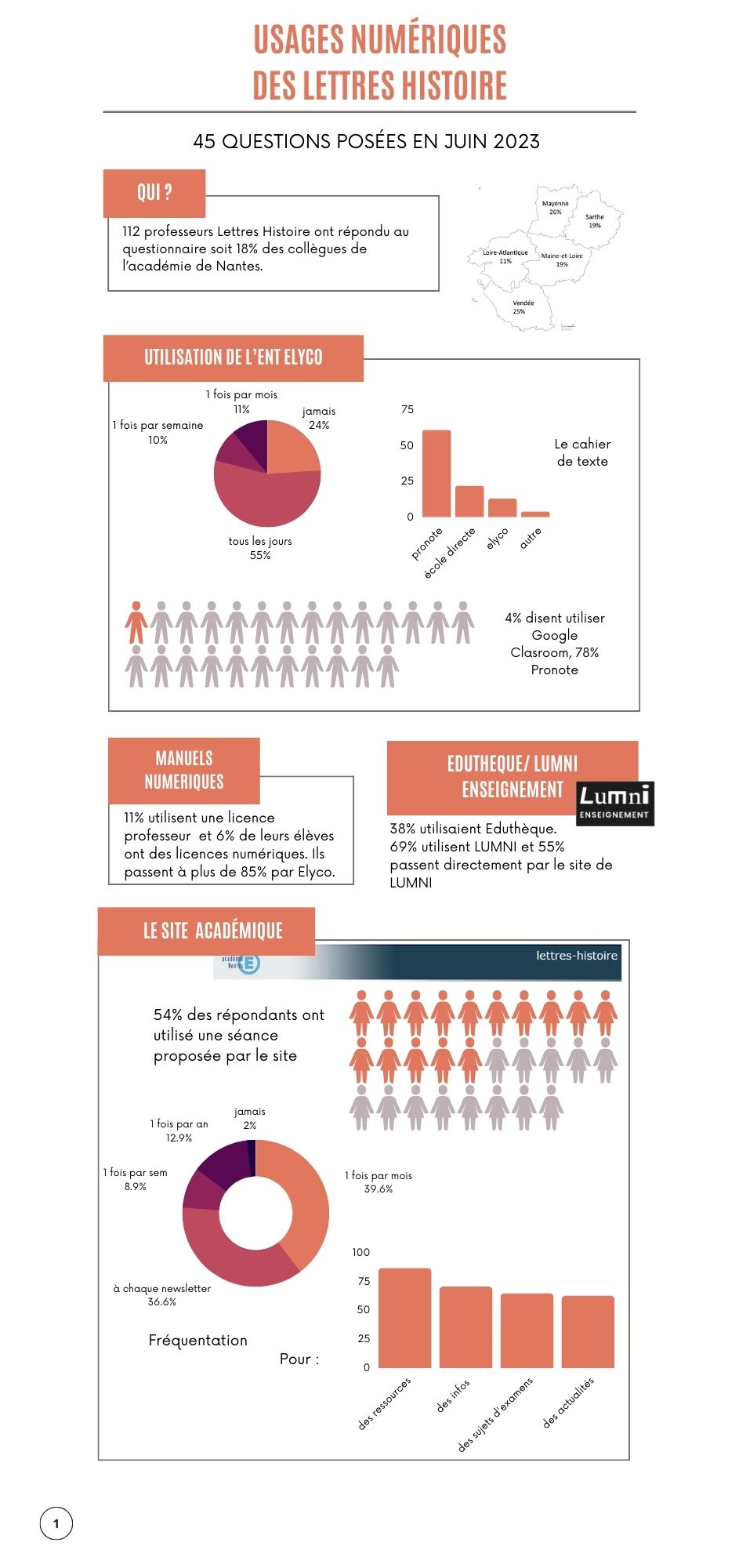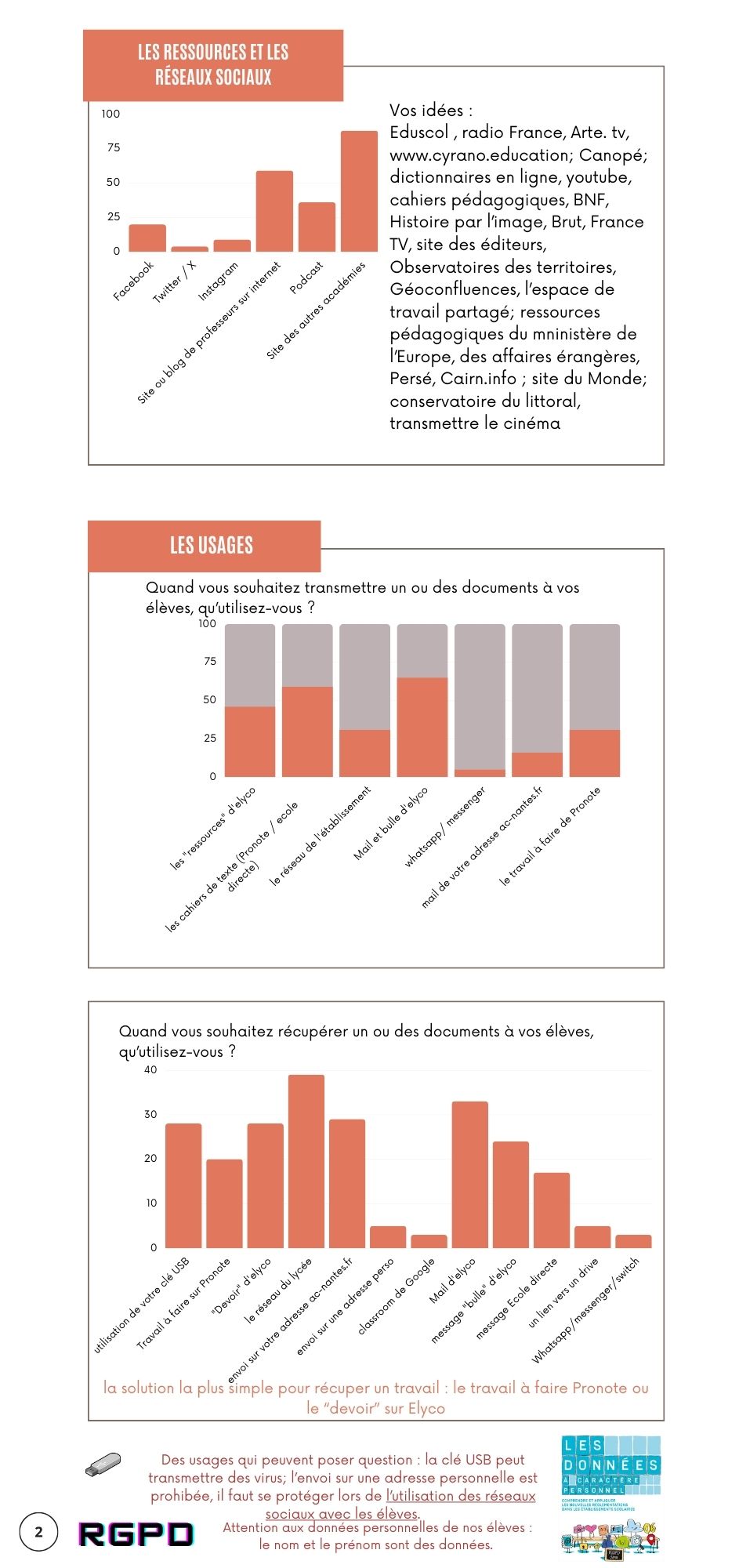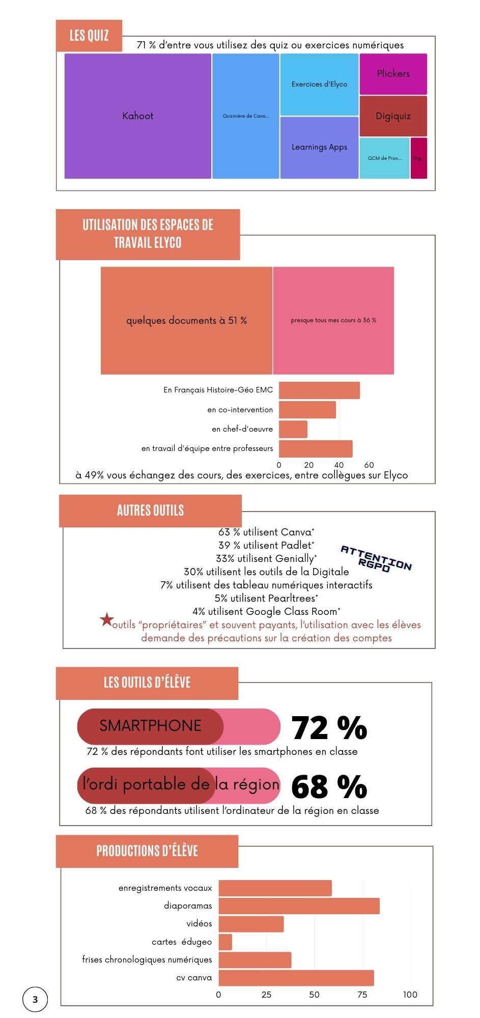 Étude sur nos usages numériques en classe, entre collègues et avec nos élèves. L'étude nous apprend que nous utilisons beaucoup le matériel de nos élèves (smartphone) ou les ordinateurs de la région. Nos usages sont plutôt tournés vers les ressources, moins pour faire travailler les élèves.