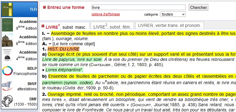 un portail lexical Le site donne accès à un portail lexical qui permet d'accéder à des ressources linguistiques issues de différents projets de recherche au sein d'un portail unique. En lexicographie, pour un même mot, il est possible de consulter les entrées, par exemple, du Trésor de la Langue Française informatisé (TLFi) ou des dictionnaires de l'Académie Française (4ème, 8ème et 9ème édition).