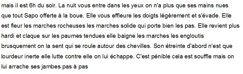 Dans la 5ème phrase, la machine tombe dans le piège de l'homophonie et retranscrit « elle est fleur » plutôt que « elle effleure ». Comme dans le texte de Le Clézio l'année dernière ou celui de Kessel en 2014, la machine nous invite, par ses erreurs, à réinterroger le grain du texte, à envisager d'autres possibles, à prendre des chemin de traverses ... peut-être plus poétiques. Après tout, à quel nom commun renvoie le pronom personnel féminin qui ouvre la quatrième phrase ? N'est-il pas possible que ce soit la nuit, reprise du sujet de la deuxième phrase, plutôt que la boue ?
