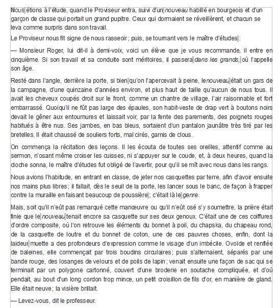 Pour mon cours de lundi dernier, en M3, j'ai imprimé mon texte, les premières pages de Madame Bovary en un seul exemplaire, que j'ai ensuite reproduit en 28 exemplaires dans le format habituel, Arial 12 interligne simple. Afin de rendre la lecture plus facile à Matisse et Isel, j'ai imprimé ce même texte en deux exemplaires au format obtenu par ma macro «DYS». Ce dernier tenait forcément sur plusieurs pages.