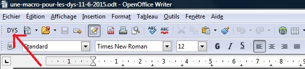 Désormais vous disposez d'un bouton personnalisé, nommé ici «DYS» et qui me permet en un seul clic d’adapter tout le contenu d’un document Openoffice pour mes élèves.