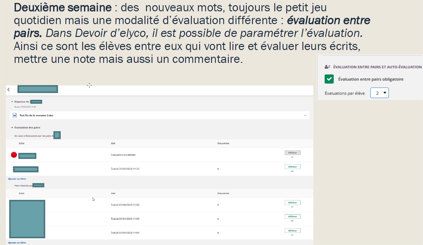 À partir de la deuxième semaine, une autre contrainte apparaît : l’évaluation par les pairs. En effet, Elyco propose dans