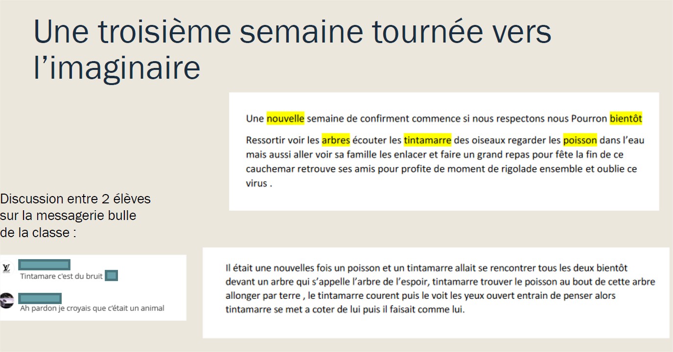 La première semaine, les mots du lexique tournent autour du moment présent, les obligeant à prendre une direction d’écriture de journal, une écriture pour soi et pour dépasser le vécu.