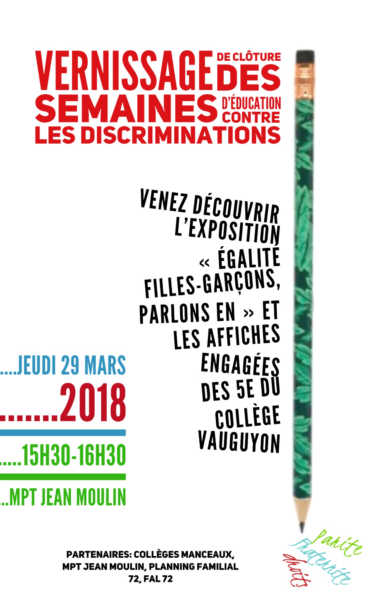 Au deuxième trimestre, ils abordent Ie sujet des discriminations en cours de français, d’arts plastiques et d’EMC. L’acculturation (textes littéraires, œuvres d’art engagées, films et court-métrages, textes de lois) se fait à la fois en amont et pendant les Semaines d’Education Contre les Discriminations (en mars de chaque année).