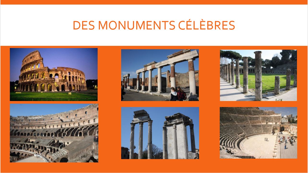 Chaque séance est en lien avec un lieu visité en Italie : le forum, le Colisée et les combats de gladiateurs, Pompéi et Herculanum.Ces séances sont dédiées à la découverte des différents lieux du voyage et de leurs principaux monuments, à l'aide d'un diaporama.