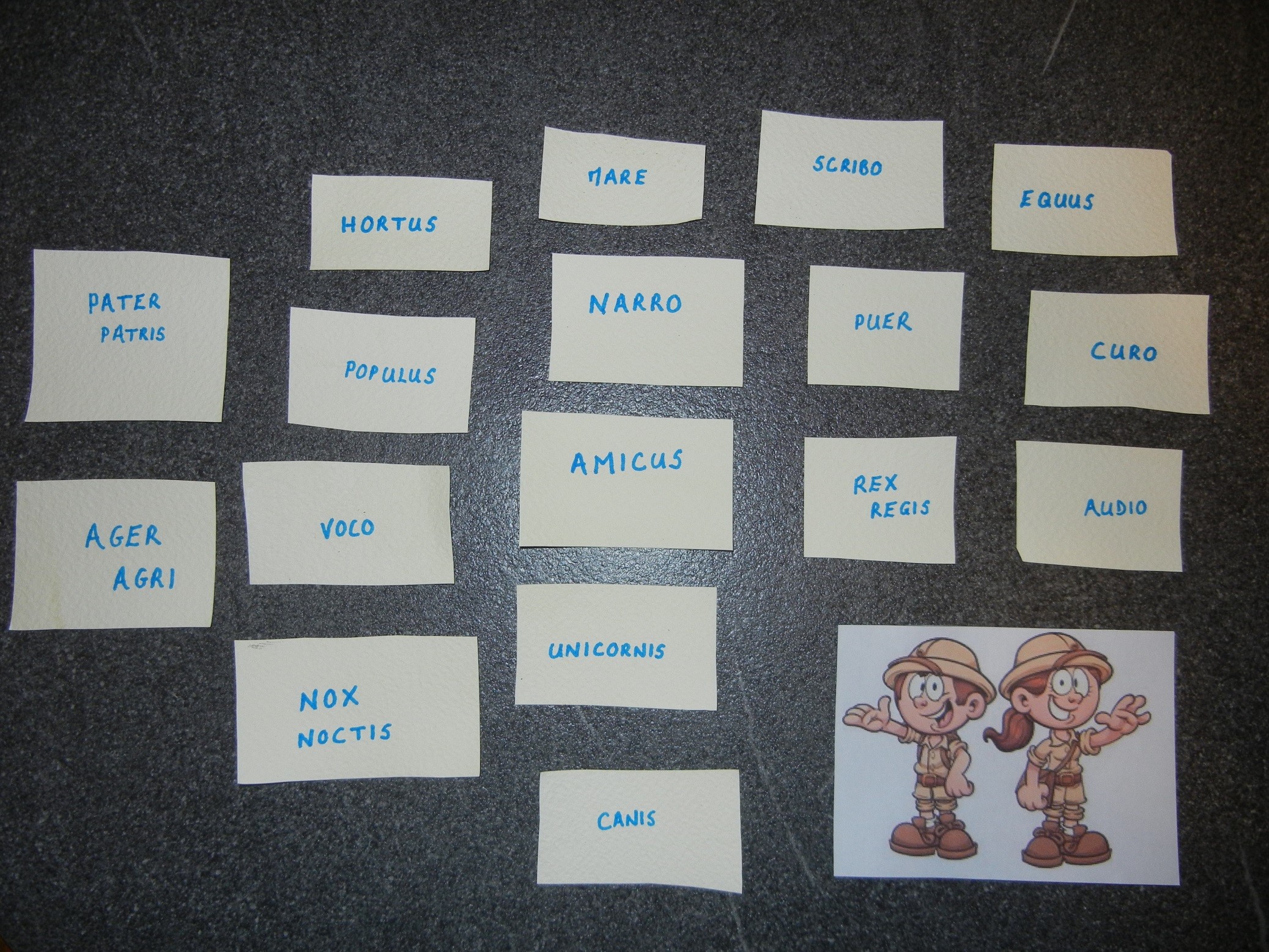 La deuxième séance a été consacrée à un travail sur l'étymologie, appelé le "Jeu des archéologues". Sur des étiquettes, imitant des "morceaux de parchemin", étaient notés des mots latins transparents "rosa, pater, ager, aqua, equus...". La mission confiée aux élèves archéologues consistait à retrouver le sens de ces mots mystérieux à l’aide de leurs dérivés en langue française.