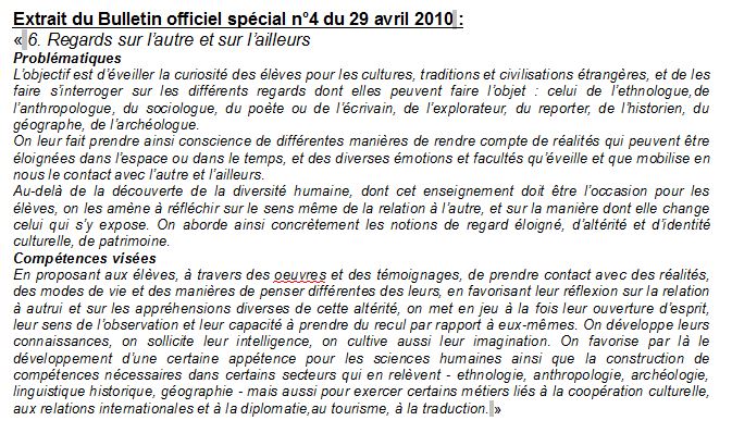 "L'objectif est d'éveiller la curiosité des élèves pour les cultures, traditions et civilisations étrangères, et de les faire s'interroger sur les différents regards dont elles peuvent faire l'objet : celui de l'ethnologue,de l'anthropologue, du sociologue, du poète ou de l'écrivain, de l'explorateur, du reporter, de l'historien, du géographe, de l'archéologue.