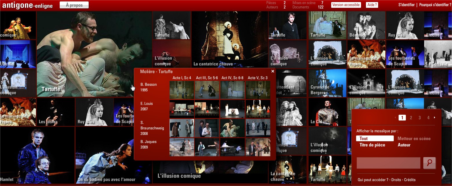 Exceptés le texte de Molière et  Le Sommaire du Tartuffe par Voltaire, le corpus de documents est extrait du site « antigone-enligne » qui, outre qu'il propose des extraits vidéo, un enregistrement sonore et  des photographies de mises en scène différentes, met également à la disposition des enseignants des fiches d'analyse et surtout des pistes pédagogiques dont j'ai fait largement usage pour bâtir cette séquence.