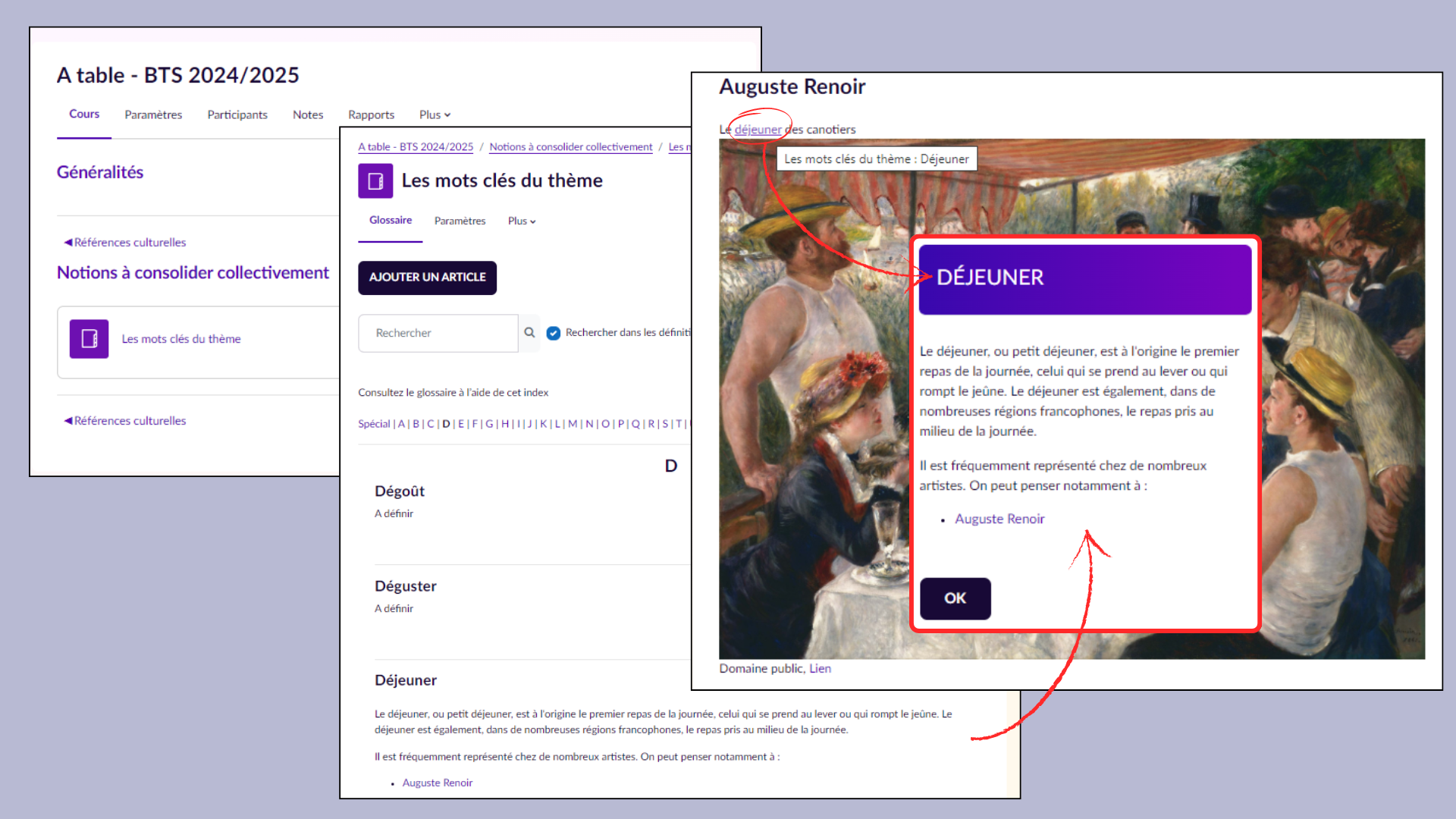 La question de l’enrichissement du vocabulaire pourra passer par l’utilisation du Glossaire. Là encore, libre à l’enseignant d’utiliser collaborativement cet outil, en laissant les élèves proposer la construction de ce glossaire. Il est évidemment possible de modérer le dépôt de nouveaux articles. Les définitions peuvent aussi proposer des illustrations multimédia voire renvoyer, pourquoi pas, à des articles d’un Wiki pour renforcer les liens entre les textes et les œuvres. Quelle que soit sa modalité de création (par l’enseignant ou par les élèves eux-mêmes), l’utilisation du glossaire dans un parcours présente l’avantage non négligeable de faire apparaitre chaque occurrence des termes définis sous forme de lien hypertexte dans toutes les activités ou ressources proposées dans le parcours et donc, par survol de ces hyperliens, d’en faire apparaitre la définition (ou illustration) associée. Voici un lien vers le Glossaire créé à partir des mots-clés et expressions recensés en accompagnement du BO sur le thème « À table ! ». Seules les entrées sont proposées, les définitions ou illustrations sont à construire (par les enseignants, mais probablement davantage par les étudiants).Des exercices H5P