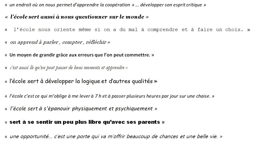 Nous avons cherché à proposer aux élèves des activités leur permettant de prendre conscience de la manière dont leur posture en classe donne une indication sur leur engagement dans le travail. En les invitant à observer des élèves dans des situations de classe (à travers des supports filmiques ou textuels) nous souhaitions les amener à se questionner : Quel genre d’élève suis-je ? Puis-je m’identifier à certains comportements ? Quelles postures nuisent aux apprentissages ? Comment les faire évoluer ? La réflexion s’est enrichie de questionnaires sur leurs pratiques de travail, de l’élaboration de leur propre portrait d’élève, de la formulation de leurs représentations sur l’école et le rôle des enseignants. Progressivement s’est dessiné, au cours des échanges et de la prise de recul de chacun, le portrait de l’élève impliqué et qui donne du sens à sa présence à l’école.