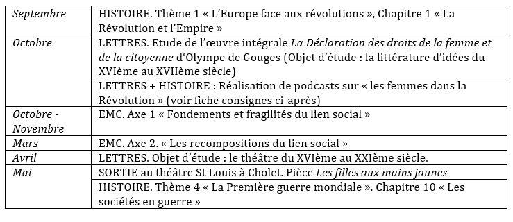 Nous avons pu lier toute l’année les programmes d’Histoire, d’EMC et de français. En Lettres, deux objets d’étude ont été concernés par le projet. Nous avons commencé en début d’année par l’étude d’Olympe de Gouges et de la littérature d’idées pour correspondre au début du programme d’Histoire sur la révolution française. La réalisation du podcast a ainsi pu permettre de faire une tâche finale complexe mêlant les acquis historiques, littéraires et transversaux, notamment pour l’argumentation et l’expression orale.