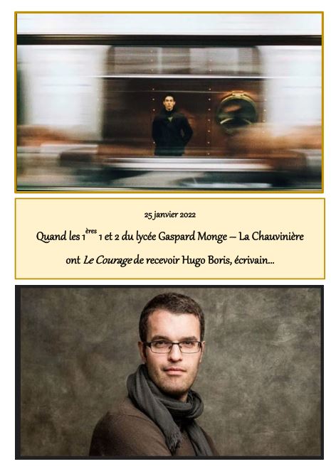 - - J’ai eu la chance de faire intervenir Hugo Boris en 2021 auprès d’une classe de 4ème au collège Paul Gauguin de Cordemais où j’enseignais encore. Le projet avait été proposé sur le site de l’académie de Nantes par la DAAC et était en lien avec la Maison des Écrivains de Paris et le Musée Clemenceau de Saint Vincent sur Jard, en Vendée. Le projet puis la rencontre avaient enrichi chacun. Le contact étant particulièrement bien passé avec l’auteur, nous avons émis le souhait lui comme moi de réitérer l’expérience. Le fait que je sois mutée en lycée interpellait également l’auteur qui trouvait un intérêt à rencontrer un autre type de public d’élèves.