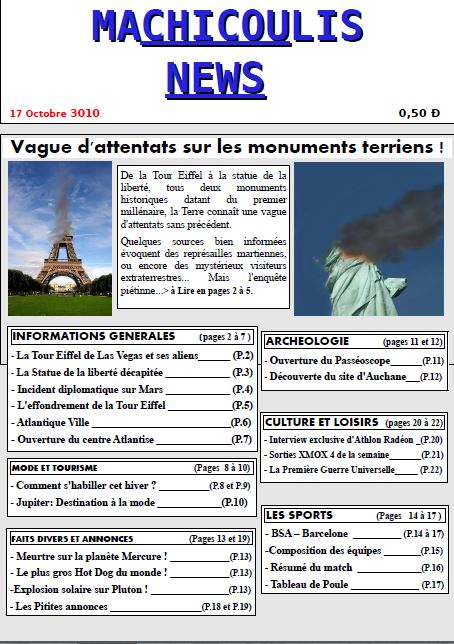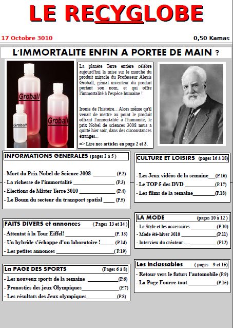 Deux classes de quatrième ont participé à ce projet, chacune d'entre elles avait en charge l'invention et la production d'une édition quotidienne d'un journal qui pourrait paraître 1000 ans après notre ère.