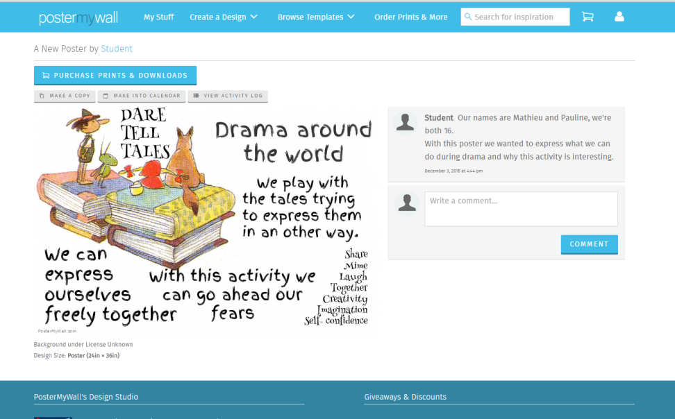 Le premier échange s’est fait à la demande de la collègue italienne, qui a proposé une activité pour "briser la glace". Elle consistait à élaborer l’affiche de notre projet : les élèves devaient créer un poster présentant l’activité drama. Cette activité a eu pour bénéfice secondaire de réaliser que les élèves avaient parfaitement compris et intégré les objectifs de l’activité "drama".