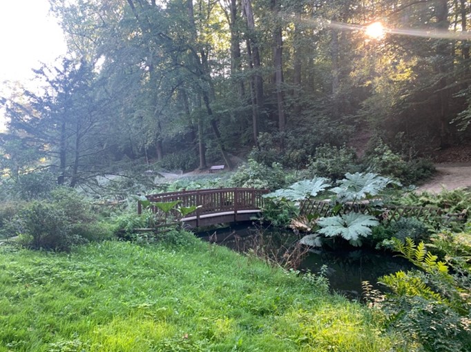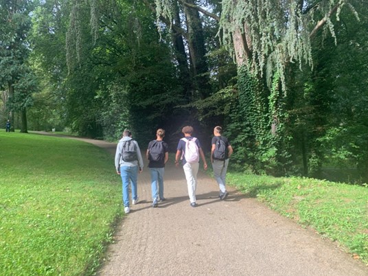 2ème temps : les élèves marchent par groupes le long des sentiers du parc, ils s’y perdent, ils laissent aller leurs pas, ils lèvent la tête pour observer en hauteur, ils écoutent les bruits du parc, ils cherchent des couleurs, des formes, ils passent les ponts de pierres, de bois, ils touchent les plantes, l’eau…