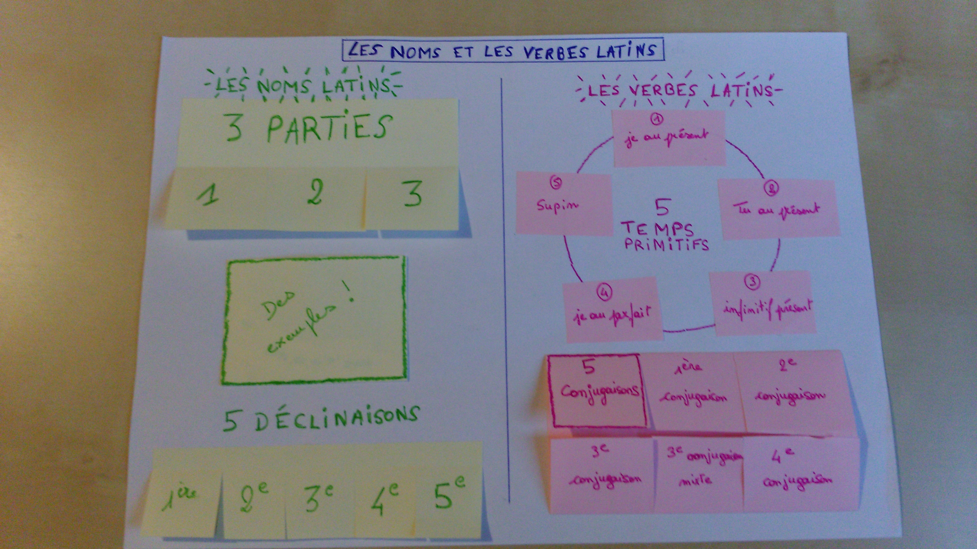Lors de la phase d’explicitation et le retour au groupe-classe, après collecte des résultats de groupe, un deuxième "Je retiens" est rédigé, fixant cette fois la présentation des verbes latins en cinq temps primitifs et le principe de discrimination des cinq conjugaisons.