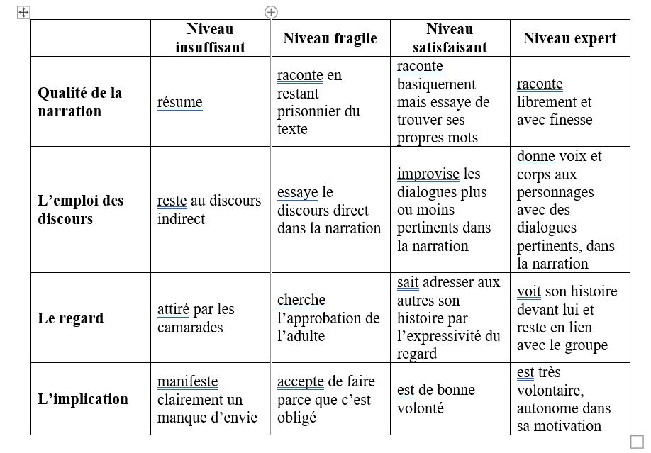 La première fiche que nous avons construite (document 2) a été faite unilatéralement ; la professeure a réfléchi et proposé ; la conteuse a récupéré cette réflexion et s’est interrogée : les progrès sont-ils si linéaires que cela ? Peut-on être sûres que le conte s’approprie ainsi ? J’ai testé en classe et j’ai effectivement pris conscience que, non seulement la démarche était trop intellectuelle face à la réalité (la conteuse avait raison !) mais qu’en plus les élèves ne rentraient même pas toujours dans les cases imaginées…