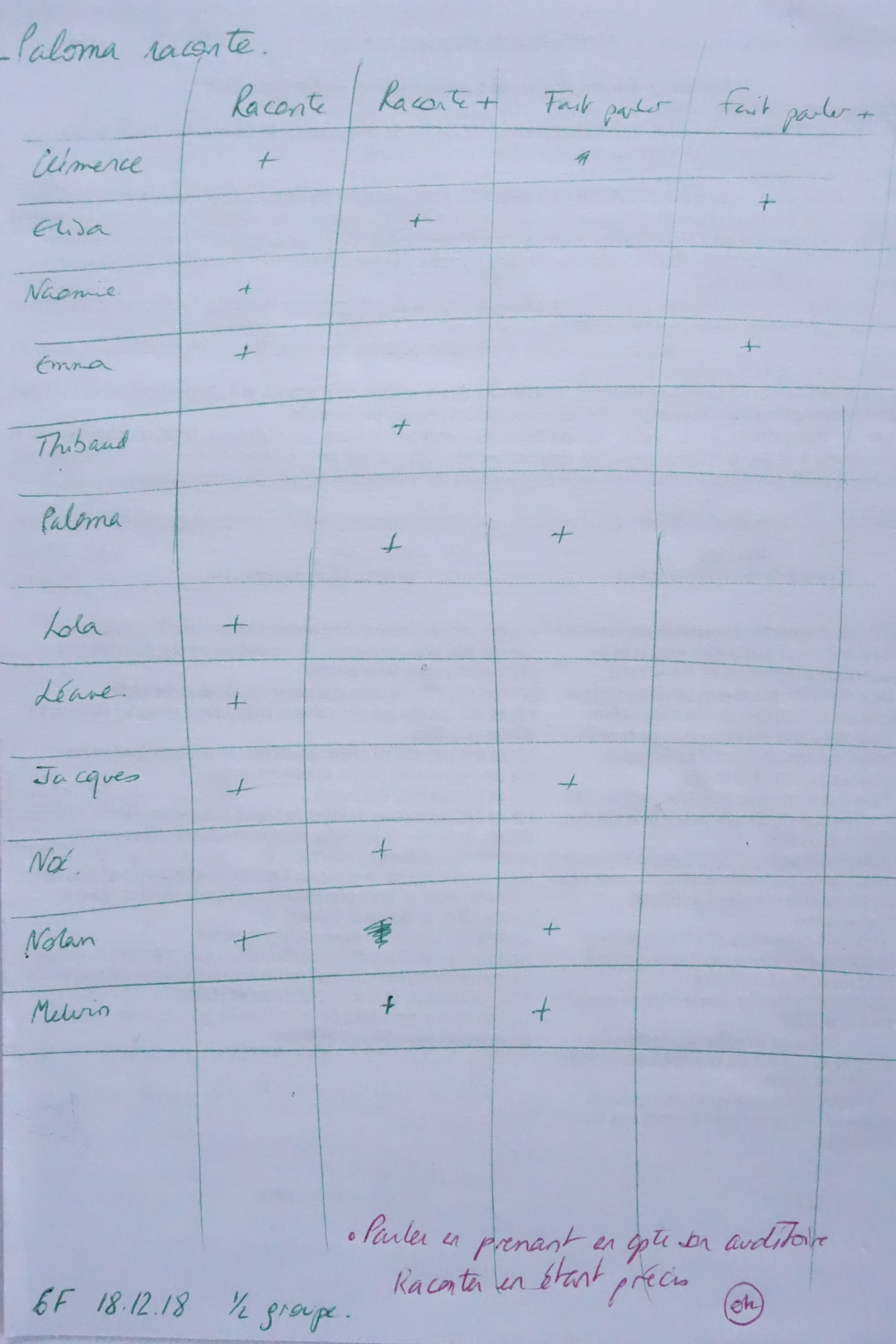 Quand le premier trimestre a touché à sa fin, nous n’avions toujours rien de très concret. N’allais-je donc rien mettre sur l’oral dans les bulletins, alors que nous avions travaillé trois mois sur l’oralité ? Nous ne nous posions pas vraiment la question la plus importante (que mettre en place, explicitement et par écrit, pour faire progresser ?) parce qu’en fait, les choses se disaient quand même lors des ateliers. Alors, rapidement, sur mes genoux, j’ai pris une feuille de papier et, pendant quelques séances, j’ai noté les prénoms des élèves qui racontaient, pour observer deux choses travaillées :