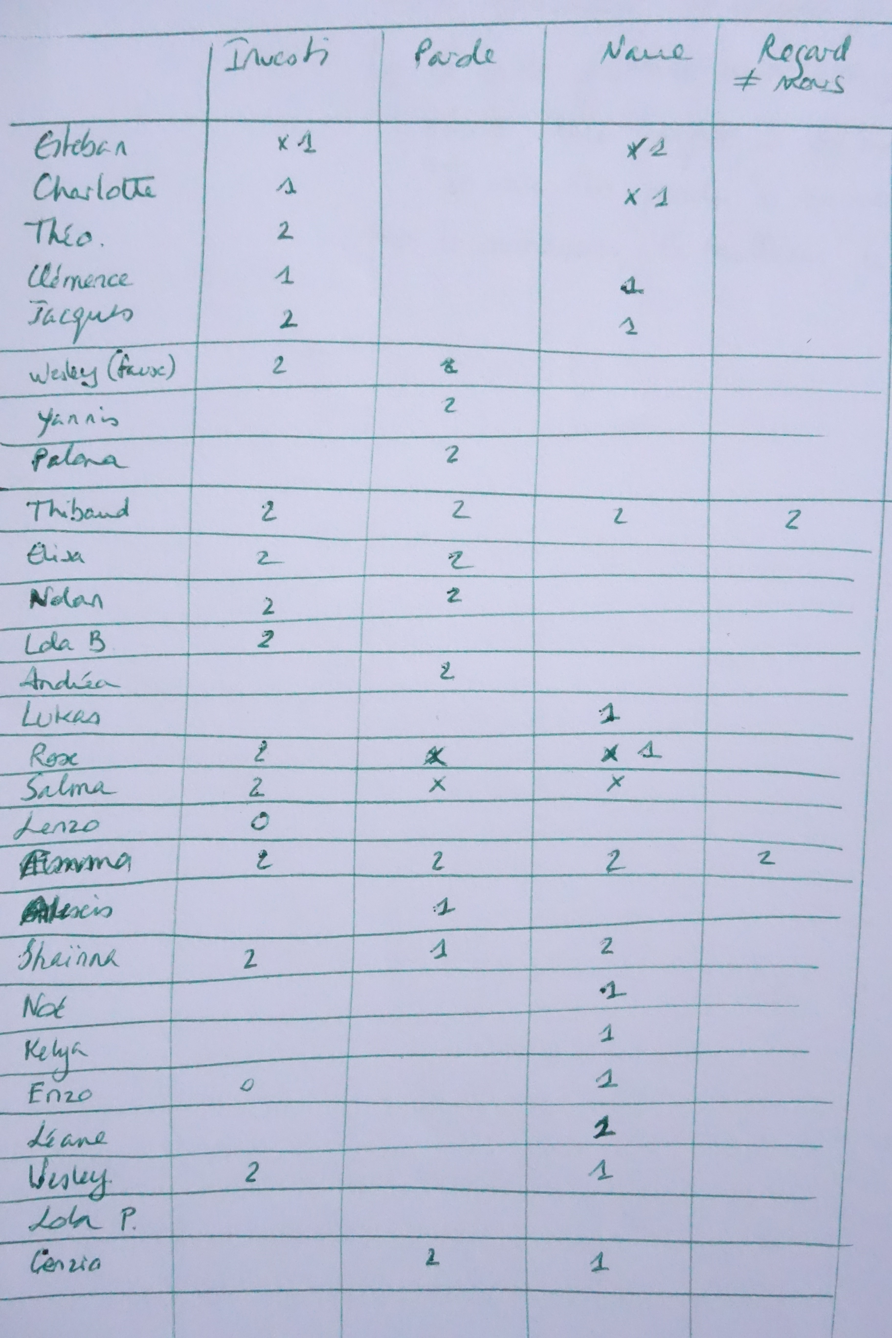 Deuxième trimestre, la feuille sur le genou s’est affinée et les évaluations bien écrites et bien pensées sont encore restées au placard. On a ajouté l’implication : est-ce que l’élève s’implique ou est-ce qu’on sent que, clairement, le travail est fait par-dessus la jambe ? On a observé aussi la coopération : dans le travail de groupe, il nous a semblé important de pointer cette nécessaire qualité. Et nous travaillions toujours sur les deux critères du premier trimestre.