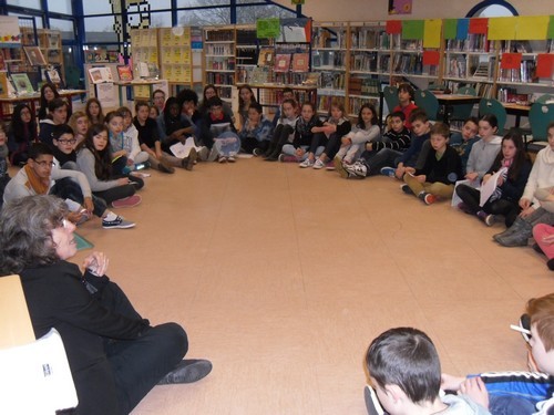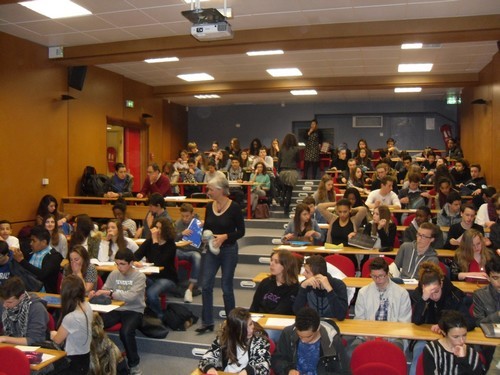 - La journée s'est poursuivie au lycée Renoir où deux classes de 3e ont rejoint une classe de 2nde. Ces 3 classes ont été accueillies dans l'amphithéâtre. Madame Audin a de nouveau répondu à toutes les questions posées par les élèves. Pendant environ une heure, ont été abordés différentes sujets : à quoi peut servir la recherche fondamentale ? Est-ce bien payé ? Comment rejoint-on l'Oulipo ? Combien y a-t-il de membres ? Est-ce international ? Quel est le domaine de vos recherches ? Combien de livres avez-vous écrit ?