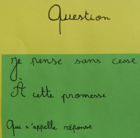 - travail par groupe (niveau 6e) à mi-chemin entre poésie et mathématiques, au CDI, en classe de français et en autonomie sur la lecture à voix haute de poèmes, l'écriture de formes poétiques brèves (haïkus, calligramme, textes mis en musique, réécriture à partir de listes de mots, acrostiches, autres textes à contraintes ...)