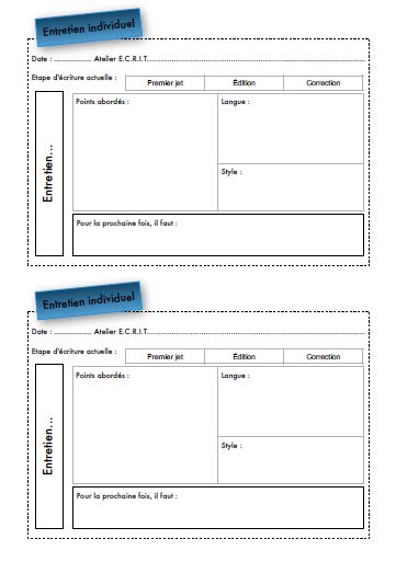 Obligatoire pour chaque élève à n'importe quelle étape d'écriture. Le professeur rencontre au moins une fois de manière individuelle chaque élève pour faire le bilan de son écrit et pour l'aider à choisir un ou plusieurs points sur lesquels se concentrer. Le professeur et l'élève remplissent une fiche bilan de cette rencontre.