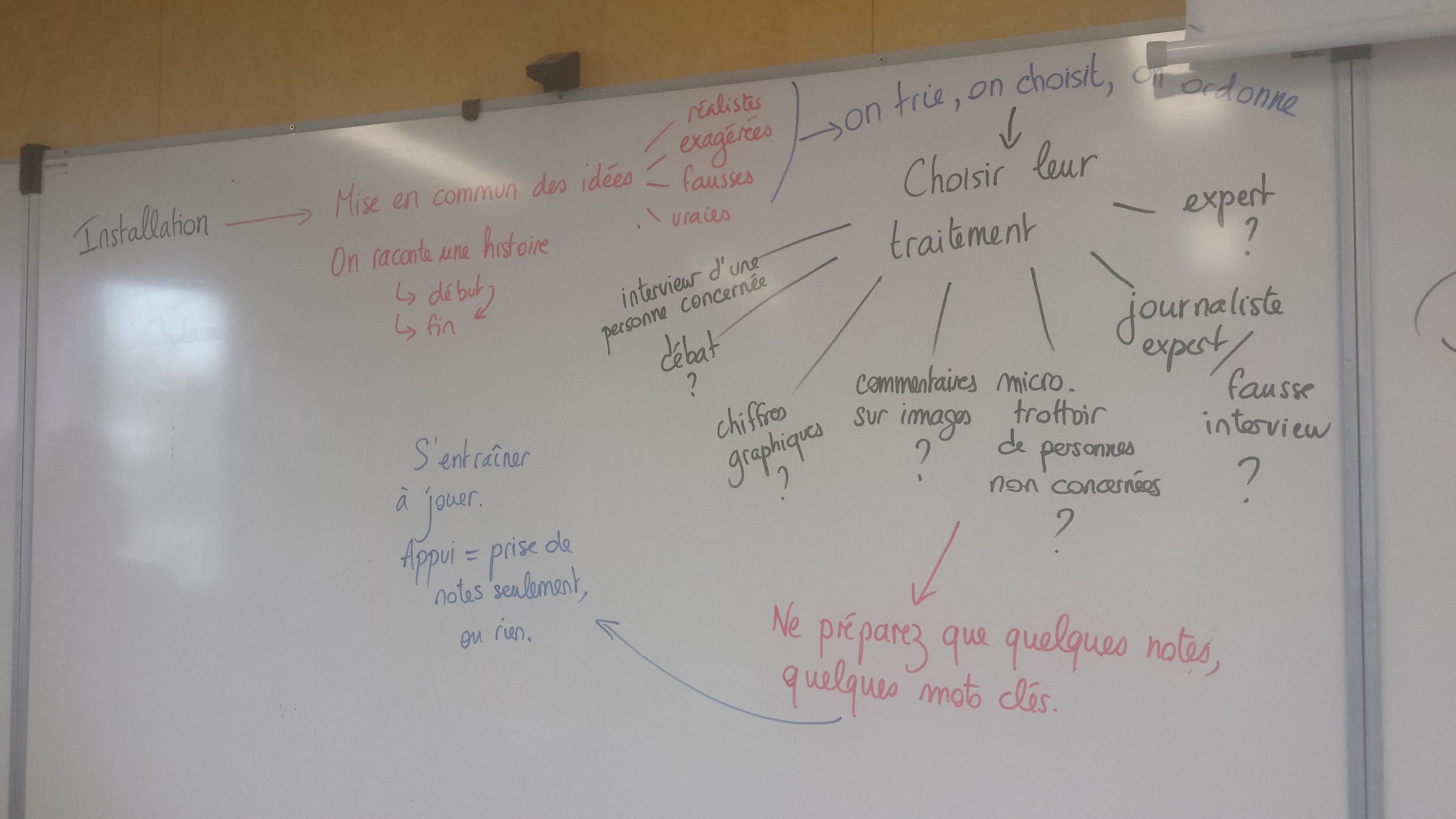La classe est divisée en trois groupes. Chaque groupe a un événement à présenter à la façon d'un journal télévisé qui met en application les principes du storytelling.