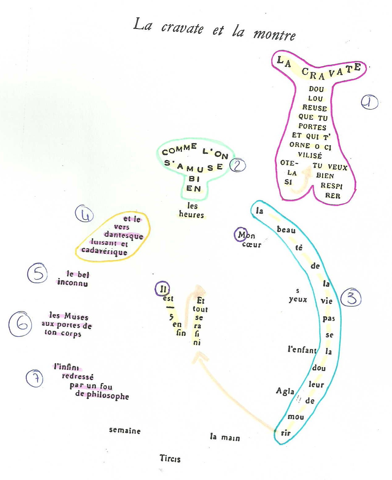 Même si peu d'élèves ont finalement reconstruit le texte dans sa totalité, le croisement de leurs diverses propositions permet de faire émerger non seulement une version avec une mise en page classique mais aussi des éléments pertinents de lecture qui permettent de comprendre le texte. Trop souvent, il est fait de la lecture du calligramme une question de mise en page ; ici la complexité du texte montre bien que la mise en page classique ne suffit nullement à dégager du sens et que le texte conserve un caractère énigmatique. Il perd même une partie de sa lisibilité dans la mesure où c'est la disposition qui permet d'identifier comme telles les énigmes marquant les heures. L'observation au cas par cas des propositions a aussi permis d'affiner le profil des élèves et d'évaluer leur posture de lecteur/chercheur.