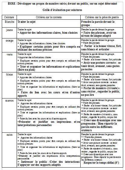 Ensuite le professeur distribue la grille avec les couleurs de ceintures (ou les élèves colorient en suivant les indications d'internet) et explique que l'oral va être évalué par le biais de ceintures mais qu'il reste à déterminer les critères qui permettent de valider chaque ceinture : ce qui va être objet de la séance et servira pour l'évaluation de tous les travaux de ce genre, toute l'année, dans X matières.